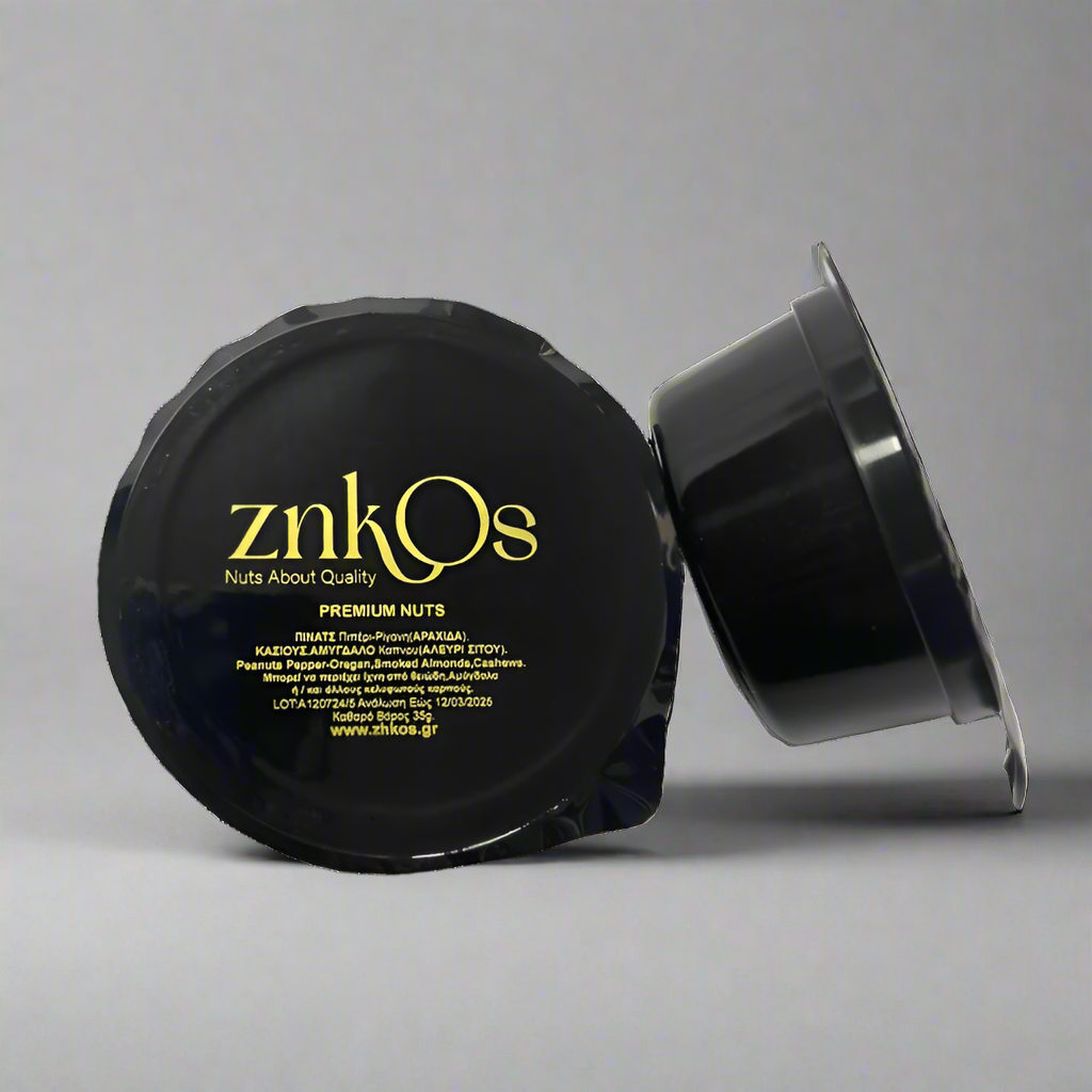 A premium selection of pepper-oregano peanuts, roasted almonds, and salted cashews. Refined, delicious, and made with care.